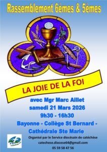 Samedi 21 mars 2026 de 9h30 à 16h30, aura lieu le rassemblement diocésain des 6/5èmes à Bayonne, au collège Saint Bernard et à la cathédrale Sainte Marie. Le thème : les vertus théologales.