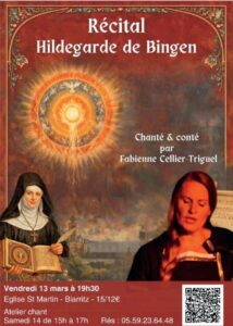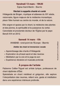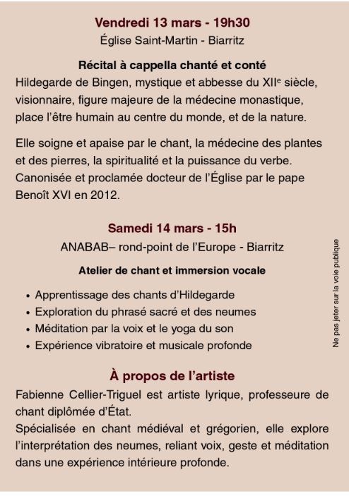 L’association ANABAB (Association Nouvelle Acropole Bayonne-Anglet-Biarritz) organise un récital médiéval à cappella chanté et conté, du répertoire Hildegarde de Bingen, par la cantatrice soprano Fabienne Cellier Tiguel, vendredi 13 mars 2026 à 19h30, en l’église St-Martin à Biarritz. Ce récital sera suivi d’un atelier choral samedi 14 mars 2026 de 15h à 17h, dans les locaux de l’ANABAB, au 1 rond-point de l’Europe à Biarritz. —