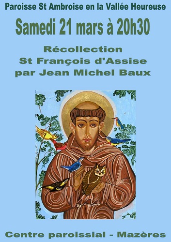 Samedi 21 mars 2026 à 20h30, la paroisse St Ambroise en la Vallée Heureuse organise une récollection sur le thème de St François d’Assise, animée par Jean Michel Baux. au centre paroissial de Mazères-Lezons.—