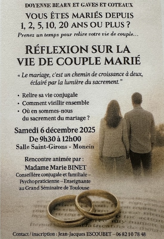 Samedi 6 décembre 2025 de 9h30 à 12h, dans la salle Saint-Girons de Monein, le doyenné Béarn/Gaves et Côteaux organise une rencontre animée par Marie Binet (conseillère conjugale et familiale – psychopraticienne – Enseignante au Grand Séminaire de Toulouse) sur le thème « Réflexion sur la vie de couple marié ».