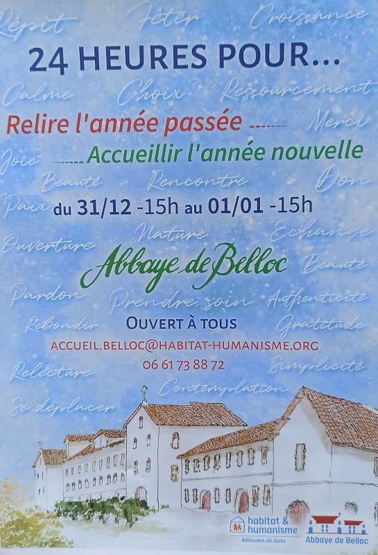 Du mercredi 31 décembre 2025 à 15h au jeudi 1er janvier 2026 à 15h, « l’association Accueil à l’Abbaye de Belloc – Habitat & Humanisme » (association non confessionnelle) propose un parcours de 24 heures : « Relire 2025… Accueillir 2026 », à l’Abbaye de Belloc (585 route de Belloc 64240 Urt).