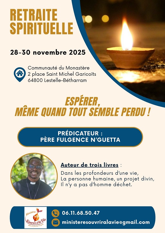 Du vendredi 28 novembre (17h) au dimanche 30 novembre 2025 (16h), le Sanctuaire Notre Dame de Bétharram propose une retraite spirituelle animée par Père Fulgence N’Guetta (Prêtre du Sacré-Cœur de Jésus) et dont le thème est : « S’ouvrir à la vie – Espérer, même quand tout semble perdu » .