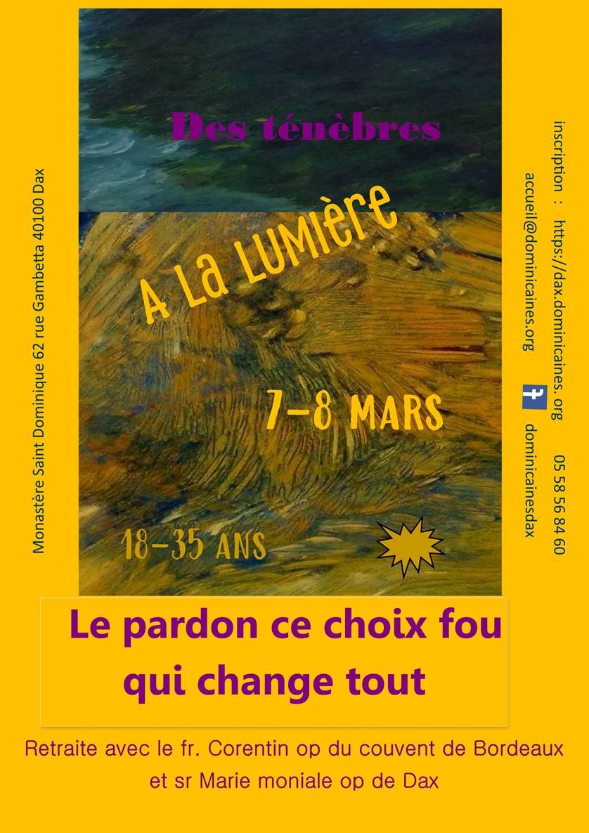 Du samedi 7 mars au dimanche 8 mars 2026, le monastère des dominicaines propose une retraite spirituelle animée par Frère Corentin op du couvent de Bordeaux et Soeur Marie Moniale op, dont le thème est : « Le pardon, ce choix fou qui change tout» .