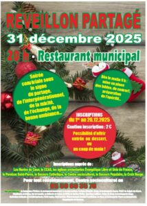 Un Réveillon partagé du 31 décembre 2025 est organisé au restaurant municipal d’Orthez (rue Jean-Marie Lhoste) à 20h, temps convivial et fraternel, sous le signe du partage, de l’intergénérationnel, de la mixité et de l’échange pour fêter le nouvel an. Il est ouvert à tous, à ceux qui sont seuls ou qui souhaitent partager avec d’autres ce moment joyeux. Vous pouvez aussi vous inscrire comme bénévole pour aider.