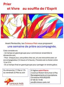 Du dimanche 17 mai à 17h au vendredi 22 mai 2026 au soir, à l’église St Pierre (2 av. Robert Schuman) de Pau, la semaine de prière accompagnée arrive avec l’Esprit saint pour nous préparer à la belle et grande fête de Pentecôte ! N’hésitez pas à faire connaître cette expérience de prière. Elle peut être un moment fort pour chacun ! Nous avons choisi de terminer le vendredi soir afin de permettre à tous de vivre Pentecôte en famille. —