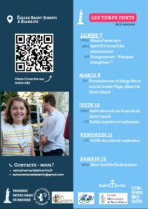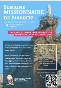 La Semaine Missionnaire de Biarritz se déroule du lundi 7 au samedi 12 juillet 2025 à l’église Saint-Joseph. Cet événement annuel rassemble une cinquantaine de missionnaires, débutants ou expérimentés, pour évangéliser et annoncer le Christ. Chaque jour, des enseignements sont donnés par Monseigneur Aillet.