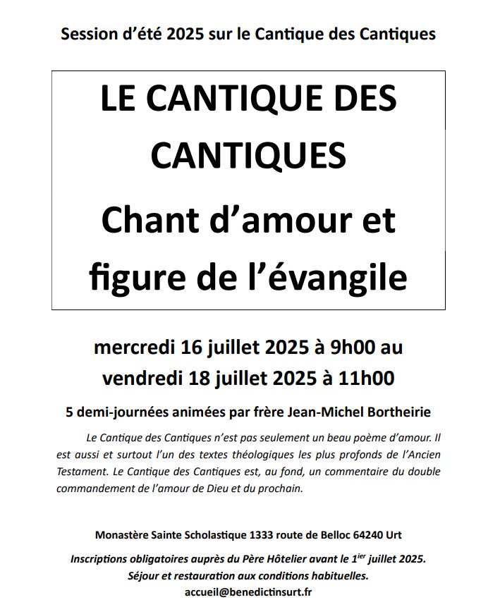 Du mercredi 16 juillet à 9h au vendredi 18 juillet 2025 à 11h, est organisée une session d’été sur le Cantique des Cantiques au Monastère Sainte Scholastique à Urt.