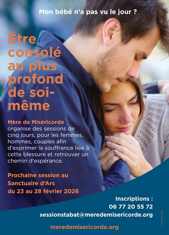 Du lundi 23 février au samedi 28 février 2026, Mère de Miséricorde organise une session Stabat de 5 jours, pour les femmes, hommes, couples, afin d’exprimer la souffrance liée à cette blessure et retrouver un chemin d’espérance, au Sanctuaire d’Ars (ain). — Une stabat permet de se réconcilier avec soi-même et sa propre histoire sous la tendresse du regard de Dieu. Cinq jours de silence avec un accompagnement individuel, des enseignements et des temps liturgiques.