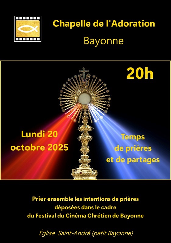 Lundi 20 octobre 2025 à 20h, un temps de prière et de partage est organisé à la Chapelle de l’Adoration, à l’église Saint-André de Bayonne. Il s’agit de prier ensemble les intentions de prière déposées dans le cadre du Festival du Cinéma Chrétien de Bayonne.