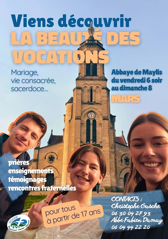 Le service diocésain des Vocations organise un week-end pour venir découvrir la beauté de l’appel de Dieu dans l’Eglise (Mariage – Vie Consacrée – Sacerdoce), du vendredi 6 mars au soir au dimanche 8 mars 2026. Ce week-end « Viens découvrir la beauté des vocations » s’adresse aux jeunes du diocèse de Bayonne (à partir de 17 ans) et aura lieu à l’Abbaye de Maylis dans les Landes.—