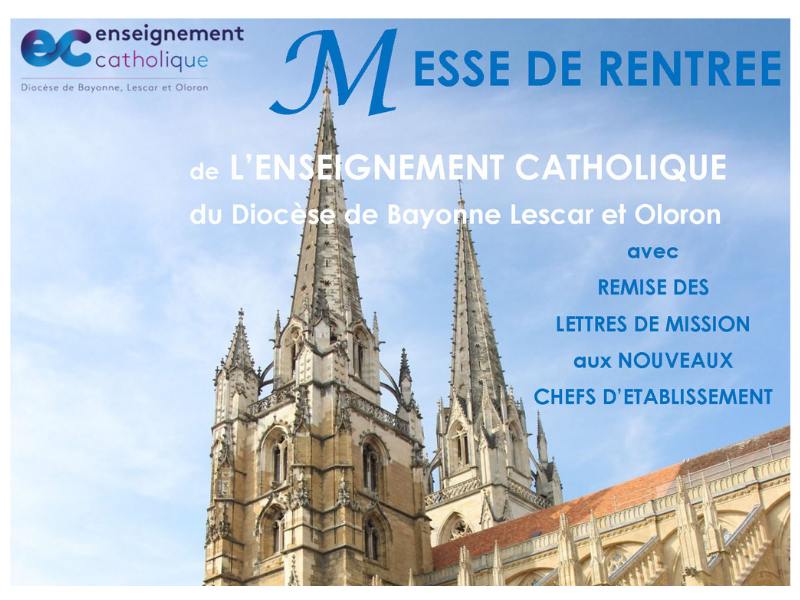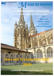 Mercredi 10 septembre 2025 à 18h, aura lieu la messe de rentrée de l’Enseignement Catholique à la cathédrale Sainte-Marie de Bayonne.
