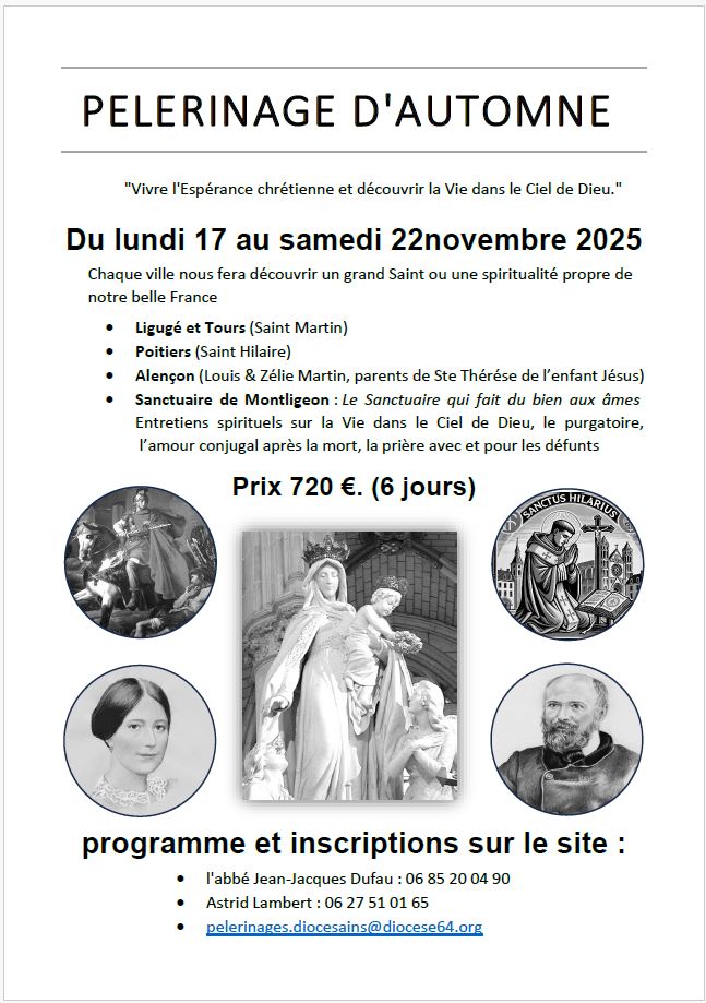 Du lundi 17 au samedi 22 novembre 2025, le service diocésain des pèlerinages organise un pèlerinage d’automne de 6 jours sur le thème « Vivre l’espérance chrétienne avec les Saints de France et découvrir la Vie dans le Ciel de Dieu ».