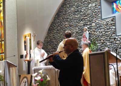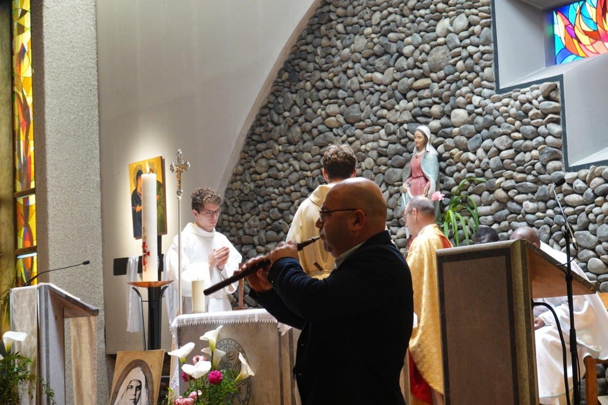 Le déroulé a fait une large part aux interventions chantées et parlées en langues araméenne et en arabe : chant d’entré en araméen, 1ère lecture en araméen, psaume en arabe, alléluia en araméen, prière universelle en plusieurs langues, chant en araméen lors de la procession des dons, Notre Père chanté en araméen, Ave Maria de Lourdes avec des couplets en araméen, en arabe et en français. Un musicien arménien, à l’aide d’une sorte de flûte traditionnelle (doudouk) a accompagné la communion de façon émouvante avec des accents graves, chauds et veloutés qui nous étaient inconnus.