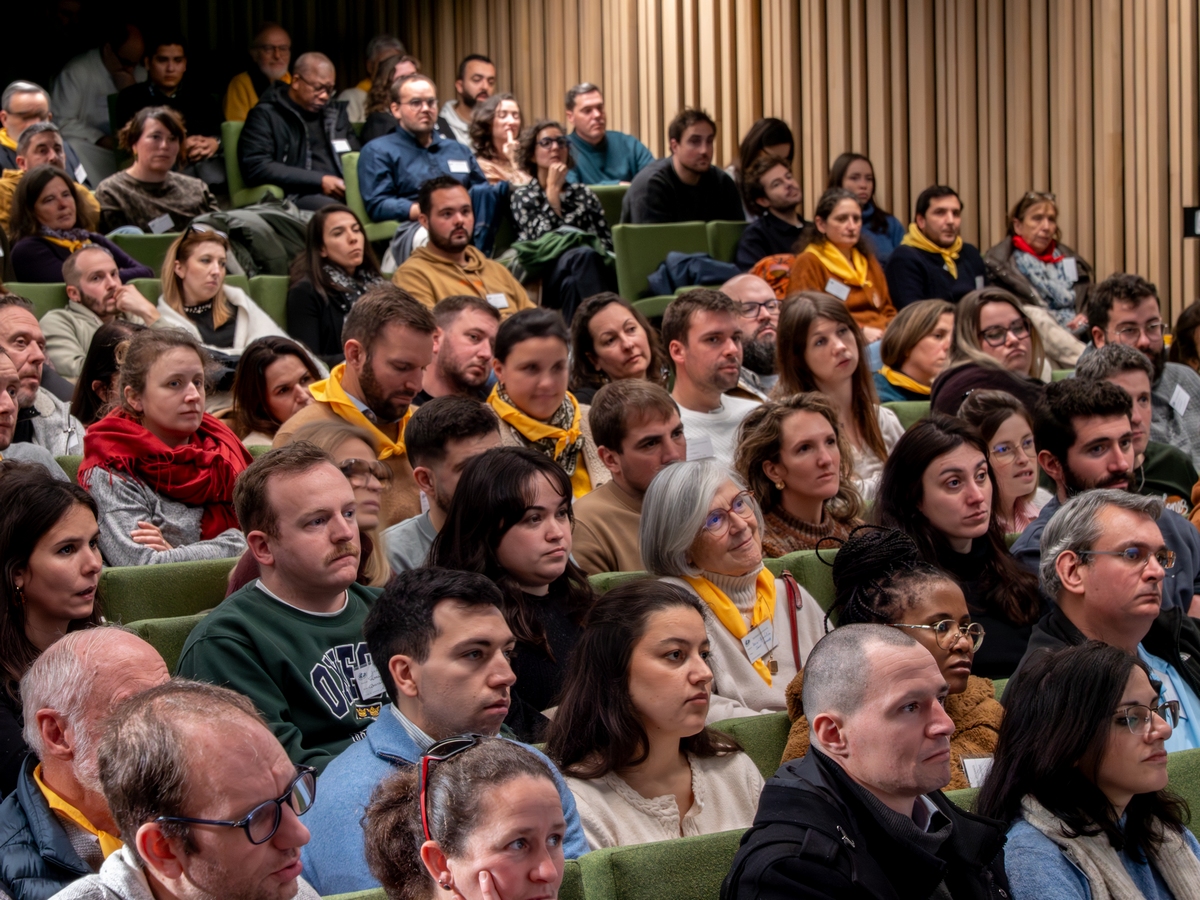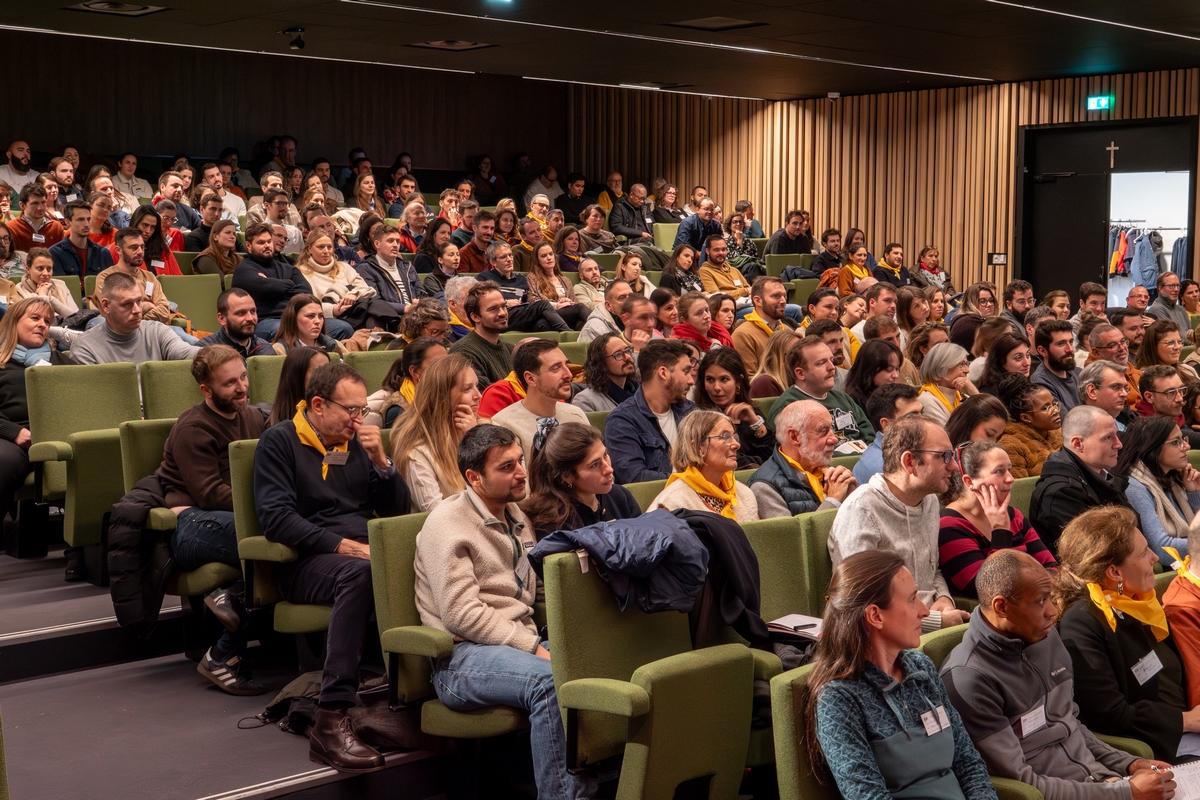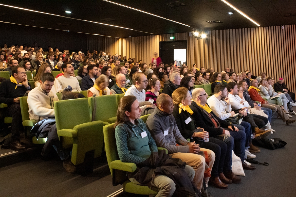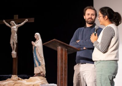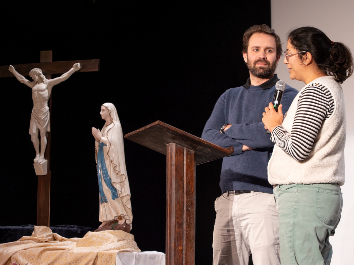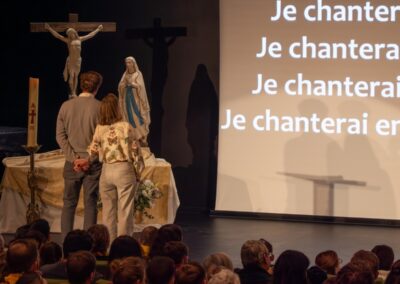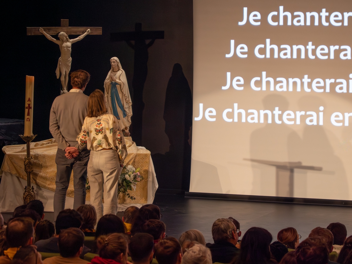 Tous se sont ensuite dirigés vers l’auditorium pour une matinée qui en aura certainement surpris plus d’un. Oratoire avec un majestueux Christ en croix et Marie priante, scénographie très pro, Claire et Rachel à la louange… tout était là pour donner une vision de l’Église en marge de certains poncifs ! Exit l’image « poussière et bricolage » !