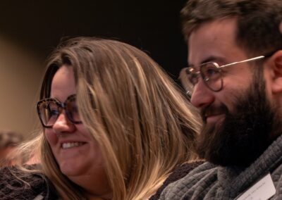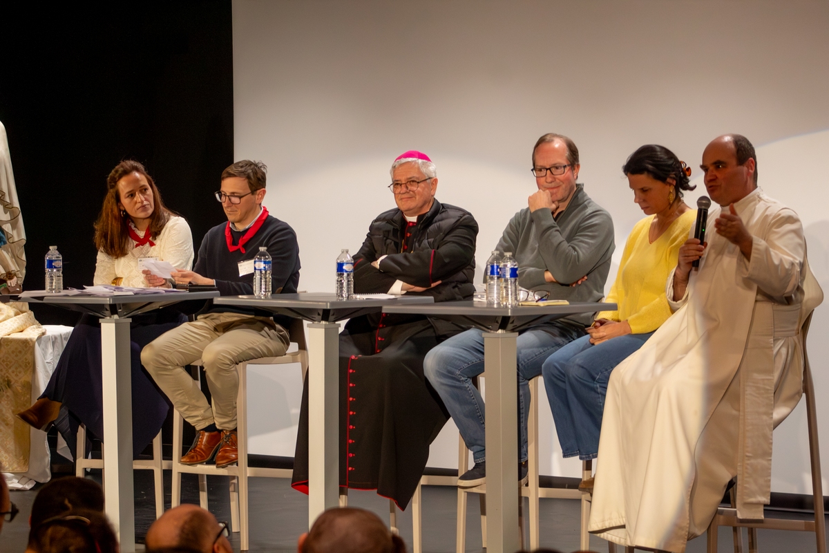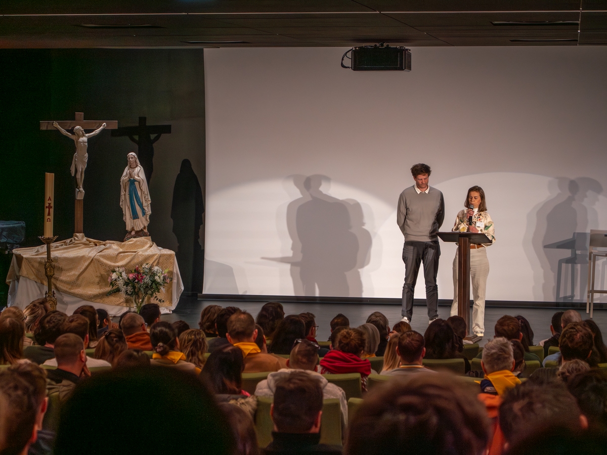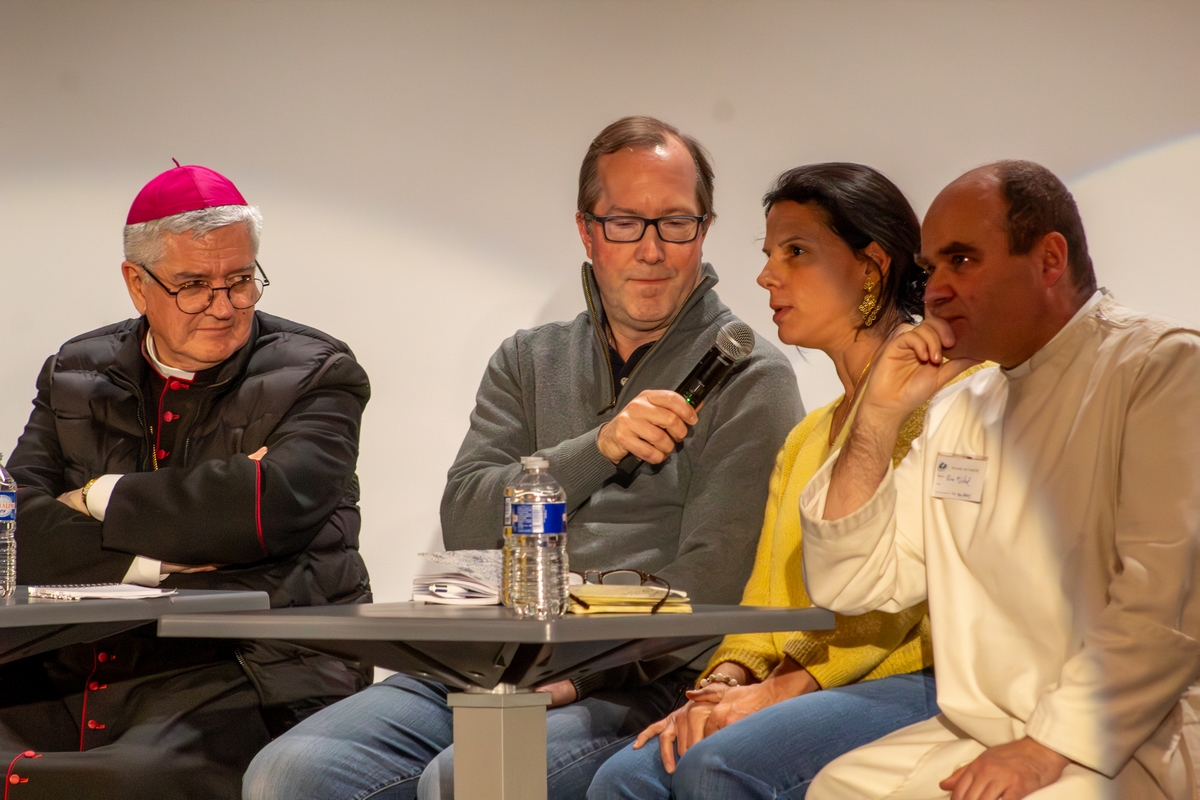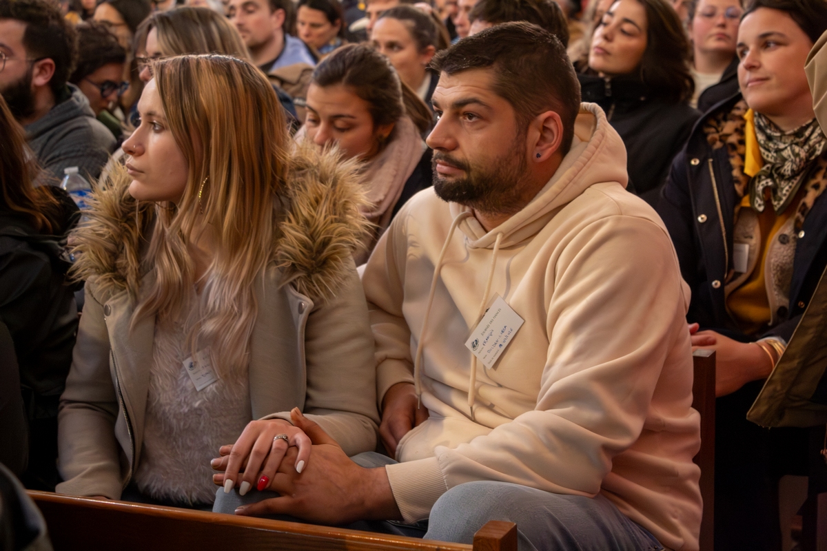 Après un rapide mot d’accueil par Mgr Aillet invitant chacun à « ouvrir les oreilles de votre cœur pour entendre cette Bonne Nouvelle du mariage et qu’elle soit capable de toucher votre cœur et changer votre vie », Caroline et Édouard Bresson, responsables de la Pastorale Familiale, prennent le micro.