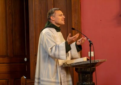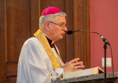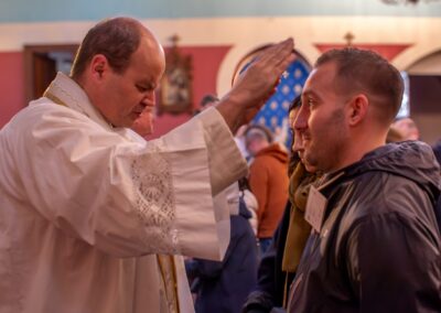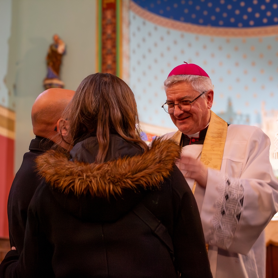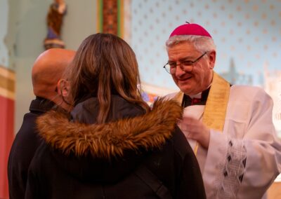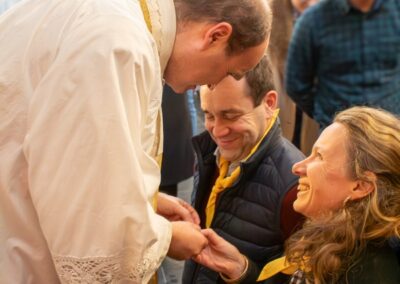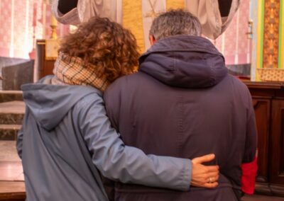La journée tire à sa fin. Les partages ont été riches, les questions précises et les réponses tout autant. Tout le monde se retrouve alors dans la chapelle de l’Immaculée Conception où Mgr Aillet proclame l’évangile de Luc et plus précisément le texte des Noces de Cana à une assistance studieuse, avant de l’éclairer par une courte homélie permettant à chacun de faire le lien entre Parole et réalité de vie. Puis vient le temps de la bénédiction. 5 prêtres et un diacre rejoignent alors Mgr Aillet pour permettre à chaque couple de fiancés de recevoir la bénédiction. Les regards sont timides, enjoués, émerveillés, certains sont debout, d’autres agenouillés, chacun vient avec ce qu’il est mais reçoit ce même Amour. Plusieurs s’en retourneront avec les yeux… humides !