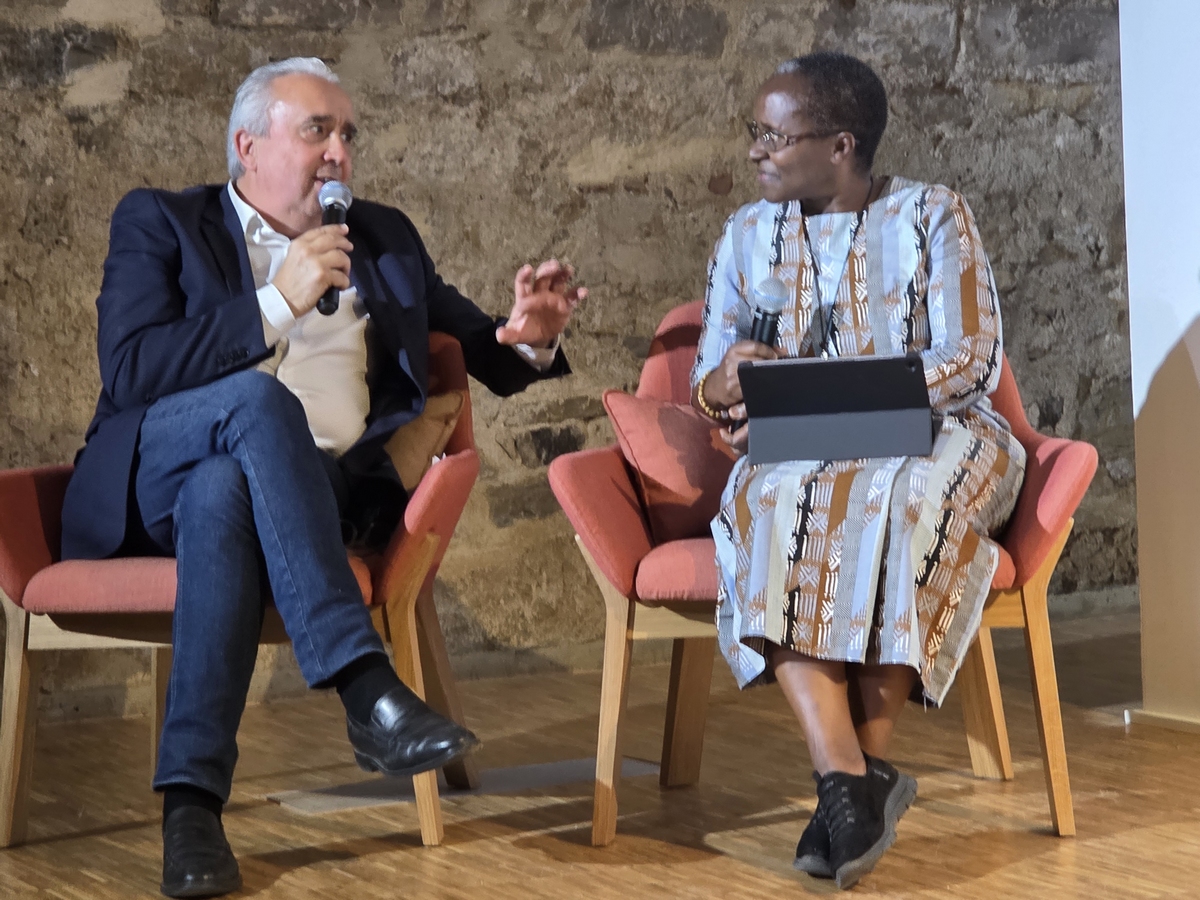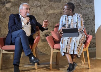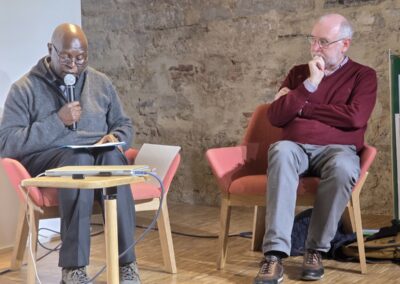 En fin de journée, une table-ronde* s’est tenue dans l’auditorium de la nouvelle médiathèque de Bayonne en présence de M. Christian Lecointe membre de la famille Lathrille (mère du cardinal Lavigerie), M. Etienne Rousseau-Plotto, historien, Sœur Angéla Kapitingana, supérieure générale des Missionnaires d’Afrique – Sœurs Blanches et Père Aloysius Ssekamatte, assistant général des Missionnaires d’Afrique – Pères Blancs.