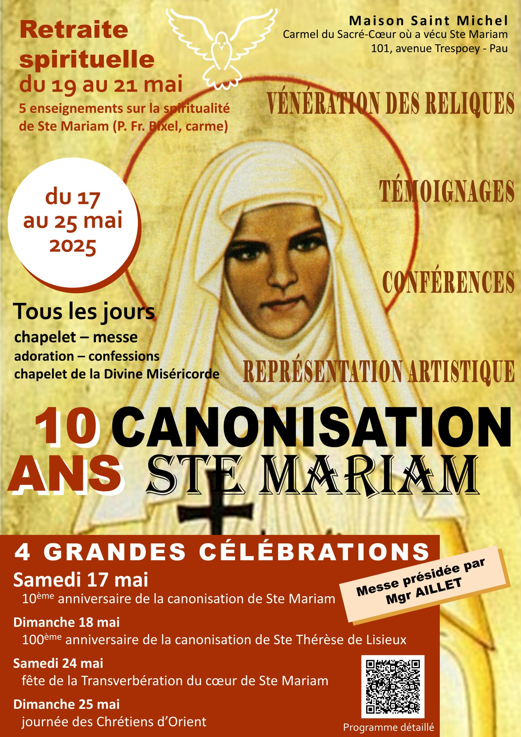 - Du 17 au 25 mai : neuvaine autour de Mariam au Carmel de Pau (maison St Michel) avec de nombreux événements.