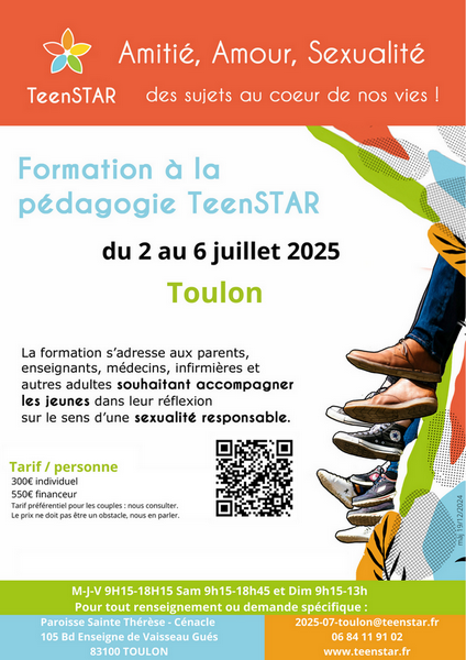 Une session de formation d’animateurs TeenSTAR aura lieu à Toulon du 2 au 6 juillet 2025. Cette formation permet à des adultes (parents, éducateurs religieux…) de recevoir les connaissances et les outils pour aller sans crainte vers les jeunes en les faisant réfléchir au sens et à la beauté de la sexualité.